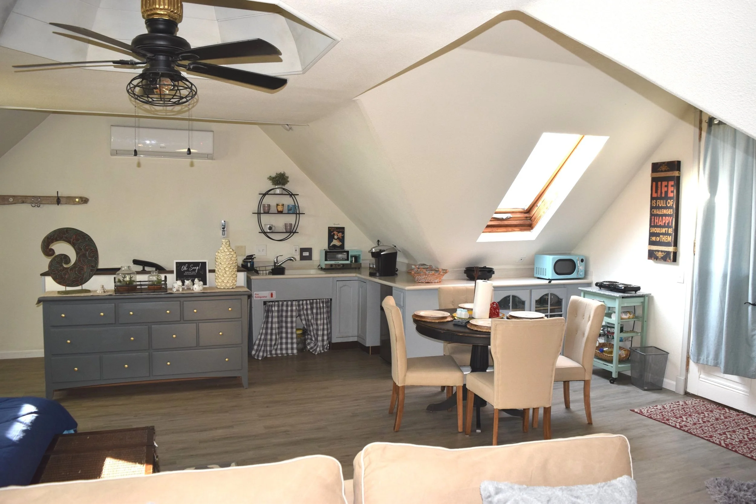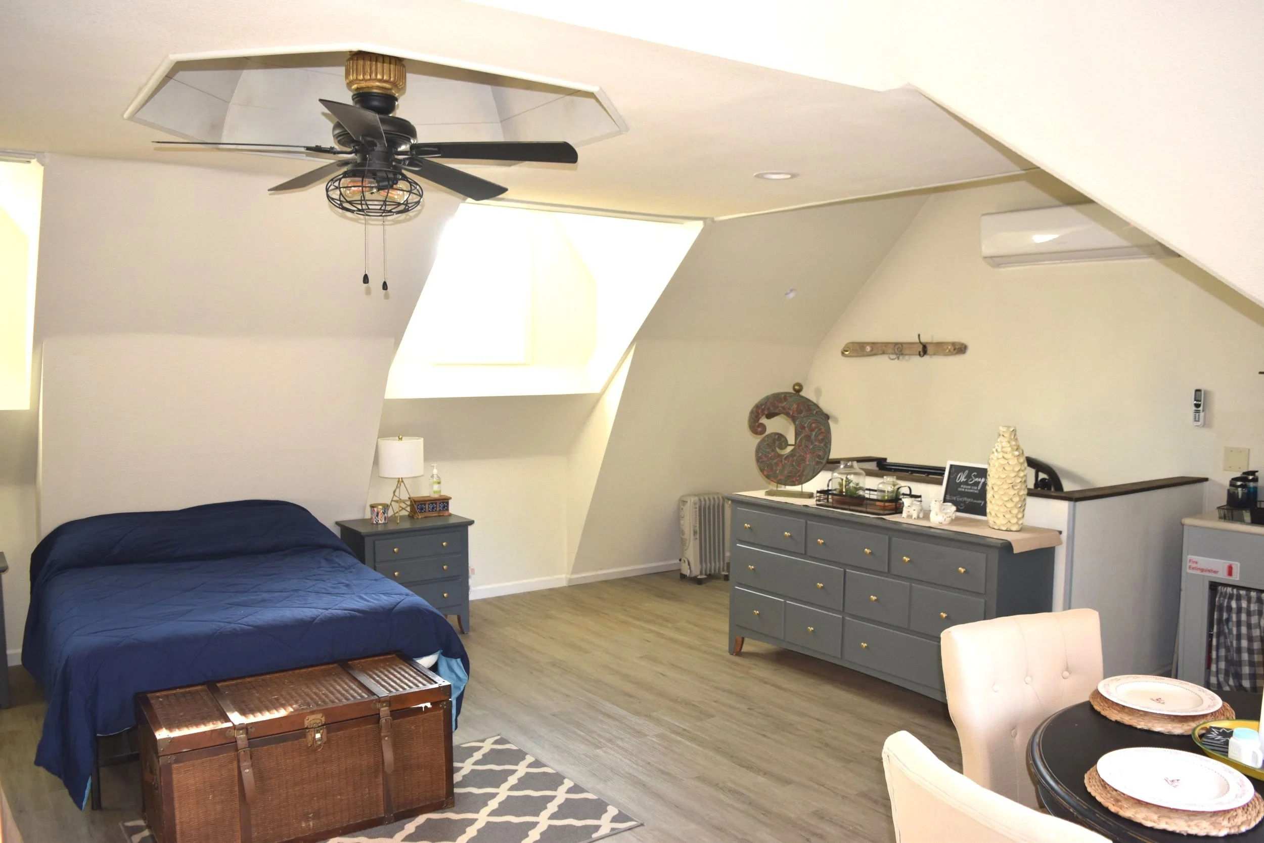 The detached, two-car garage includes a permitted upstairs loft with a spiral staircase that leads to a private bathroom. This space is quaint, cozy, and full of warm, natural light. This room is also equipped with ductless air conditioning and heat, along with a large ceiling fan for additional comfort. The loft can be utilized as a space for guests or can be used to generate additional rental income.